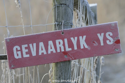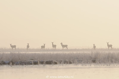 ’s Ochtends vroeg weggerden zodat ik met zonsopkomst in de Oostvaardersplassen kon zijn. Dat leek me wel wat. Nog niemand op het ijs en genieten van de stilte, het schaatsen en de vogels. Bij aankomst liep ik langs een bordje met gevaarlyk ys. Toch maar doorgelopen, want ik houd wel van gevaarlijk ijs. Bij de hut de grauwe gans was ik inderdaad de eerste die zijn ijzers onderbond. Het was een prachtige ochtend. De ganzen vlogen over mijn hoofd. Langzaam maar zeker kwamen er meer schaatsers. Ik besloot de doorsteek te maken naar de andere kant. Een beetje kruip-door-sluip-door, maar het is mogelijk. Onderweg schrok een edelhert van mij en liep snel terug. Baardmannetjes pingden er lustig op los. Aan de andere kant een stuk over de vaart geschaatst en daar zie je dan de Oostvaardersplassen eens van een andere kant. Een kant waar je normaal niet in mag komen. Lang leve het ijs! Een clubje edelherten stond in het ochtendtegenlicht en liet zich mooi fotograferen. Helaas lette ik bij het opstappen op het ijs niet genoeg op en zakte erdoor, waardoor mijn ene voet nat werd. Maar snel de natte sok uit gedaan, en op blote voeten verder. Dit doen per slot van rekening de echte wedstrijdschaatsers ook. Ik had gehoopt ook nog baardmannen op de foto te kunnen zetten, maar die bleven te diep in het riet. Wel vloog er een roerdomp over en stak er een waterral de vaart over.