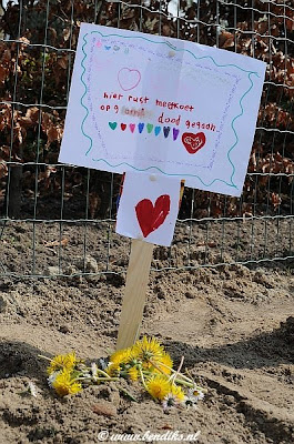 Dieke schreef over deze gebeurtenis het volgende: ‘Er was eens een meerkoet en die werd aan gevalen door een kat daarom heben ik Dieke, Loïs, Nenno en Anouk haar begraven en we heben er een bortje bij gehangen’.
