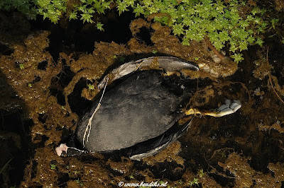 Deze meerkoet had ook nog te maken gehad met sneeuw en kou van de paasdagen (zie eerste foto). En gisteren vonden we haar ineens dood in de buurt van haar nest. Wat was er gebeurd? Ziekte, aangevallen? We weten het niet, maar mijn dochters vonden wel dat ze een waardige begrafenis verdiende. Dus hebben we deze middag een graf gemaakt met gedenksteen. Verder werd de ceremonie opgeluisterd met een toespraak over haar leven en het zingen van een lied (Jezus is de goede Herder). Ook bloemen waren geen bezwaar.