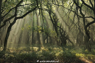 Op sommige plaatsen op de Veluwe vind je nog mooie stukjes mysterieus ‘spoekebos’. Dat is de lokale naam voor ‘spokenbos’. De rechte stammen zijn eruit gehaald, en wat overbleef liet men gewoon staan. Dit resulteerde in spookachtige grillige vormen. Zeker met mooi licht krijgt het iets sprookjesachtigs, waarbij de Orks je op een onbewaakt ogenblik kunnen overvallen. Zelf ben ik wel een liefhebber van dit soort bos. Vooral als het er ’s ochtends vroeg doodstil is en het najaarslicht op een prachtige manier naar binnen piept. De rechte zonnestralen staan hier in mooi contrast met de grillige vormen van de bomen. Ik had van deze foto 5 opnames gemaakt, om er later eventueel via HDR 1 van te maken. Deze heb ik achteraf toch niet gebruikt (leverde niet al teveel op), en heb ik de opname gebruikt met -1 belichtingscompensatie. Foto is gemaakt met mijn nieuwe Nikon 16-85 mm objectief op 52 mm. Kortom: de fotoblues zijn weer helemaal over!