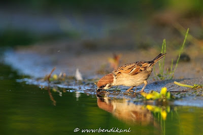 Dorstig weertje vandaag. Daarom maar een beetje, tussen de bedrijven door, bezig geweest met het vastleggen van drinkende vogels. Nog niet makkelijk, maar met de vaste schuilplekken die ik nu heb, krijg ik toch voldoende kansen. Ik vind het altijd wel mooi om vogels te zien drinken. Het heeft toch iets kwetsbaars. En zeker als je nog een mooie spiegeling kan meepakken, dan is het beeld compleet.