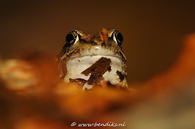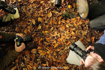 De verrassing van de dag was een bruine kikker die prachtig ging zitten tussen het herfstige beukenblad. De kikker werd omsingeld door fotografen, maar trok zich er niet heel veel van aan…