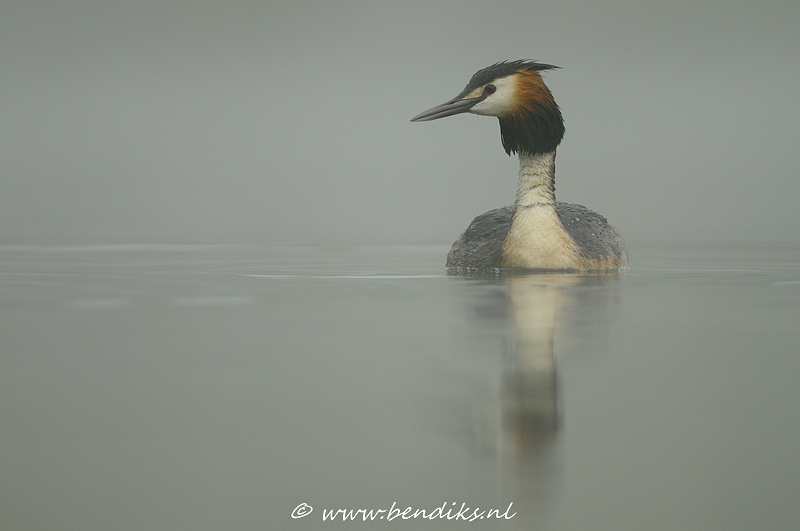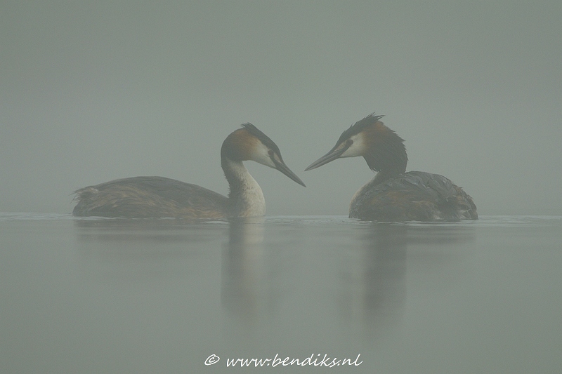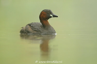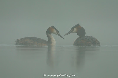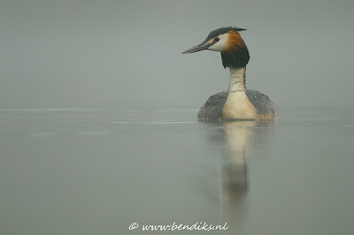 Deze morgen was ik al vroeg op mijn drijfvlotje (5:30). Het was mooi mistig en dat is voor het fotograferen van vogels niet verkeerd. Het licht is dan meestal zacht waardoor je geen last hebt van harde contrasten. Het bleef lang mistig. Pas rond een uur of 10 verdween de mist. In die tussentijd kon ik naar hartelust fotograferen. Een paartje futen was dit keer totaal niet schuw. Ook een paar dodaarsen werkten uitstekend mee. Verder nog een paartje bergeend (eerste keer bij dit plasje voor mij) en nog een eend met kuikens.