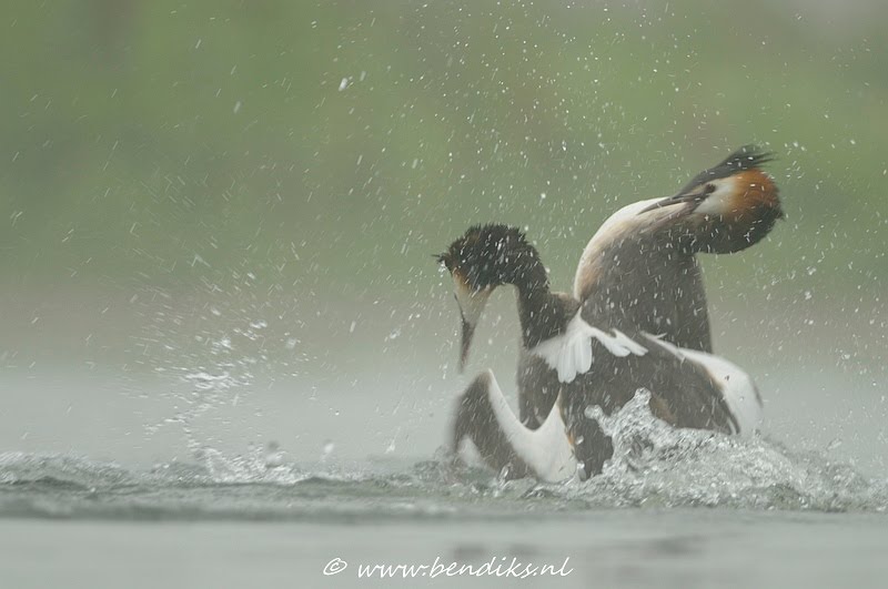 Hoogtepunt van de ochtend was toen een derde fuut zich ging bemoeien met het paartje futen. Er onstond een woeste vechtpartij waarbij de futen al hun elegantie verloren. Maar wat is dat moeilijk vast te leggen! Het gaat zo snel, dat je niet weet waar je kijken moet, laat staan dat je weet waar je klikken moet! Toch geprobeerd natuurlijk, maar de meeste foto’s zijn niet gelukt. De bovenste foto komt nog het meest in de buurt.