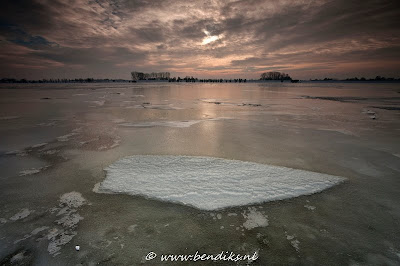 Een van de mooie aspecten van de rivieren vind ik dat het waterpeil enorm kan schommelen. In de zomer is het meestal een rustige stroom, maar door het smelt- en regenwater kan de Rijn veranderen in een brede watervlakte. Op veel plekken kan het water vrij de uiterwaarden instromen en dat geeft een enorme dynamiek aan het rivierenlandschap. Vooral als dit samenvalt met een vorstperiode, dan krijg je boeiende effecten. Zo bevriest het water vaak eerst. Gaat het water dan zakken dan krijg je een soort zwevende ijsschotsen aan bijvoorbeeld bomen, hekjes e.d. Om te fotograferen is dit ook een interessante periode. Weilanden veranderen in water of ijsvlaktes en het landschap doet heel anders aan. Omdat ik dicht bij de uiterwaarden woon, kan ik dit proces op de voet volgen. Bij de eerste foto werd ik gewaarschuwd door mijn oudste dochter die er speciaal voor terug kwam fietsen, toen ze al op weg naar school was. “Pap, vette lucht”. Inderdaad, erg vet. Bedankt, Dieke!