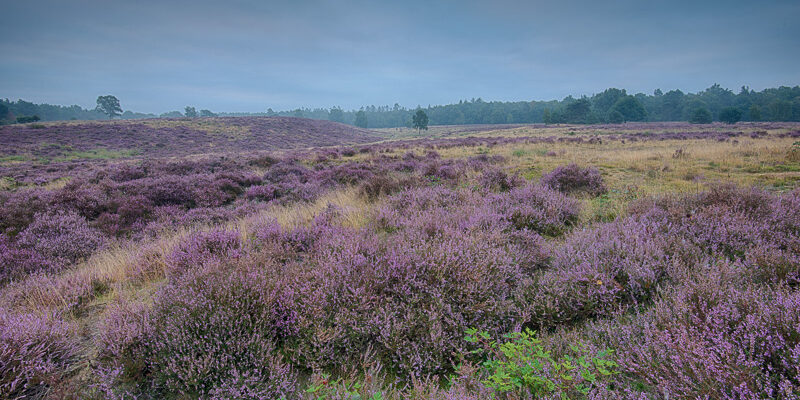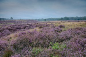 Vanmorgen vroeg op om foto's te gaan maken in een heidegebiedje vlakbij mijn huis. Toen ik op de fiets stapte was het nog donker. Er waren wolken aan de hemel, maar ook lichte stukken. Hoopvol, dacht ik. Als landschapsfotograaf ben je altijd op zoek naar de juiste mix van wolken en zon. Teveel zon en te weinig wolken wordt al gauw saai en andersom ook. Hoe dichter ik in de buurt kwam van het gebiedje, hoe meer de wolken zich samenpakten boven de hei van Laag Wolfheze. Uiteindelijk helemaal bewolkt. Enigszins teleurgesteld begon ik toch maar wat foto's te maken. De hei was wel mooi paars. Eens kijken wat er nog uit te halen viel met filters in combinatie met HDR. Met deze foto als eindresultaat.