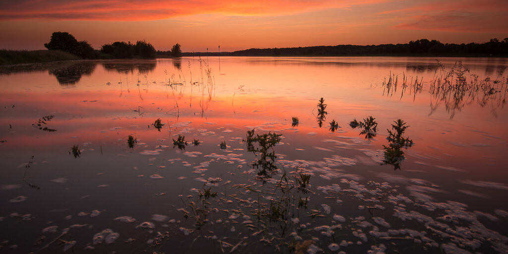 Nog even voordat het echt donker werd naar de Rijn gereden. Het water is hoog, maar ook weer aan het zakken. De distels en grassprieten komen langzaam weer boven water. Gecombineerd met een wolkenband en het nodige avondrood leverde dat de volgende foto op. Hier heb ik een grijsfilter gebruikt om een lange sluitertijd te krijgen. De lucht vervolgens ‘gedrukt’ met een zwarte hoes (de zogenaamde ‘magic cloth’ techniek).