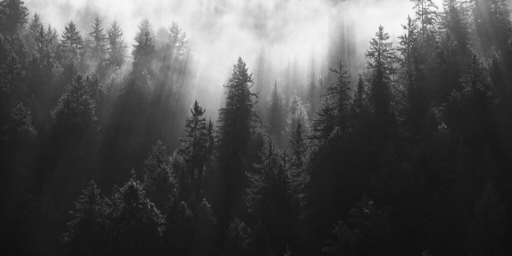 Tegenlicht blijft me trekken. Zelfs bij een ogenschijnlijk saai sparrenbos krijgt iets magisch. Deze foto maakte ik in de Dolomieten. Na een kletsnatte dag verdreef de zon het vocht uit de dalen. Foto omgezet naar zwart-wit met Silver Efex Pro. Dit vond ik een mooi effect geven in dit geval.