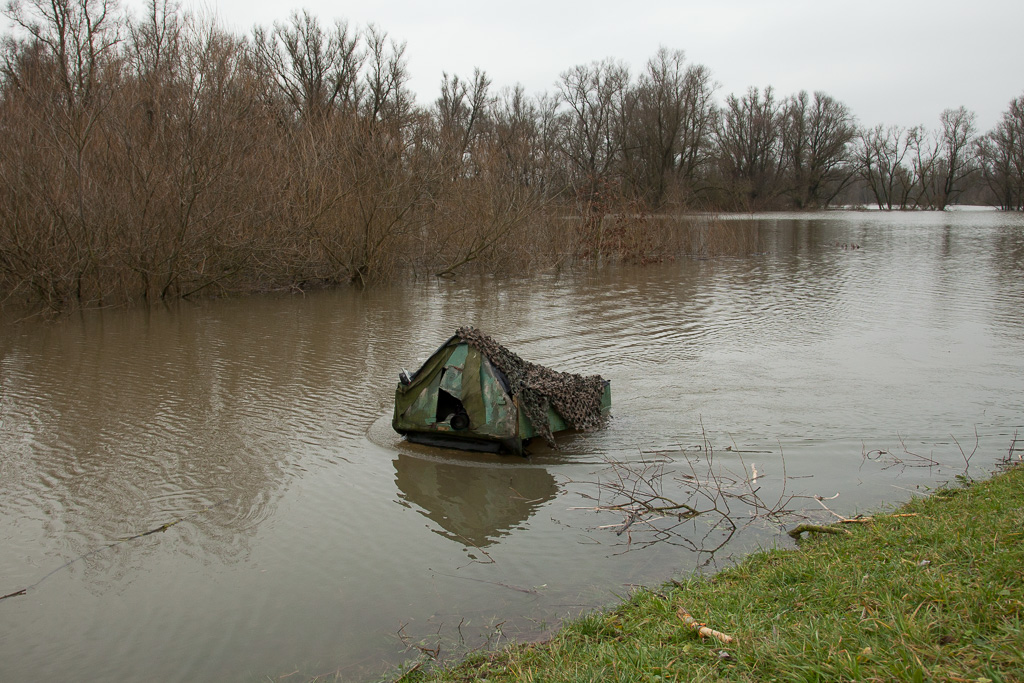 Ik begreep dat de bevers in de Millingerwaard weer op de burcht zitten, omdat de burcht ondergelopen is door het hoge water. Toen dit de laatste keer ook gebeurde (2011) was het water nog wat hoger en zaten er een aantal op een soort vlotje. Destijds wilde ik ze graag op ooghoogte fotograferen en daarom heb ik mijn drijfhut ingezet. Het leverde unieke beelden op van bevers die overdag goed vrij zichtbaar waren. Of het mocht van de beheerder weet ik niet. Het is daar wel vrij wandelen op wegen en paden, maar ja, die waren niet meer zo goed zichtbaar…
