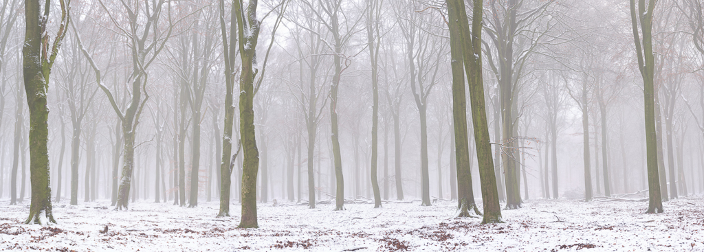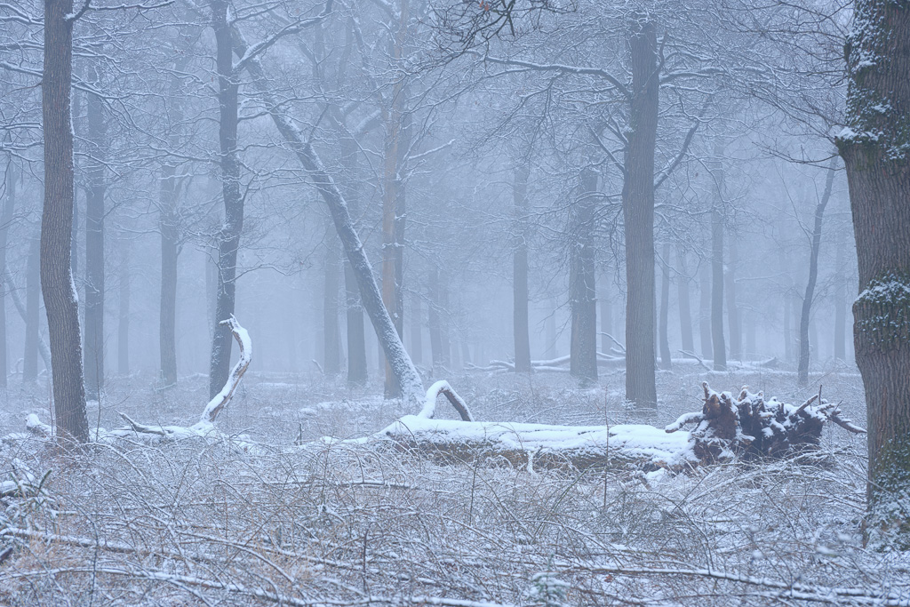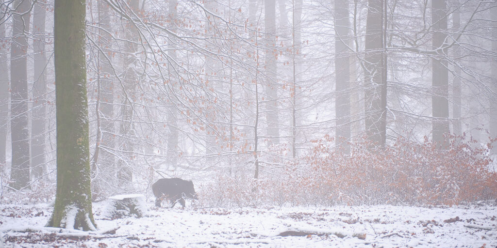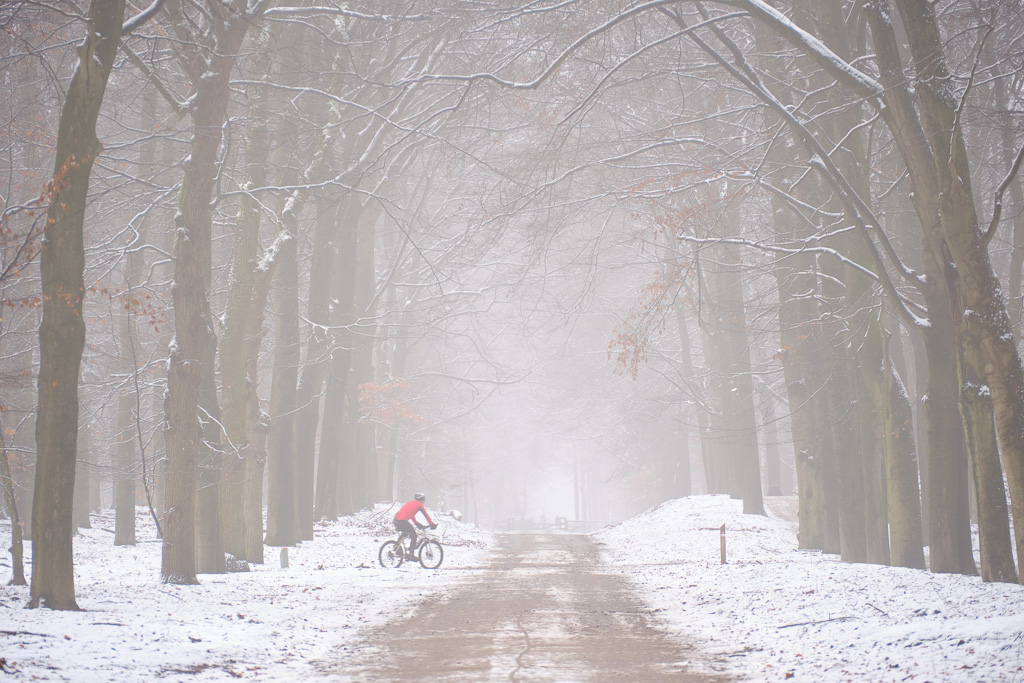 Als er 693 dagen geen sneeuw heeft gelegen, is het natuurlijk zaak om direct ’s ochtend op pad te gaan als er sneeuw ligt. Dus op naar de Planken Wambuis. Omdat de Veluwe iets hoger ligt, blijft de sneeuw hier doorgaans iets langer liggen. Terwijl ik rondliep in een favoriet stukje beukenbos, zag ik in een ooghoek een wild zwijn lopen. Met wat sluipwerk kon ik hem redelijk dicht benaderen en maakte ik met de 100-200mm lens bijgaande foto. In dit soort omstandigheden vind ik het mooier om de omgeving mee te nemen en is het niet erg als het zwijn er niet te groot opstaat. Later op de ochtend heb ik me vermaakt met foto’s maken van wandelaars en mountainbikers. Die zijn er namelijk genoeg tijdens deze lockdown.