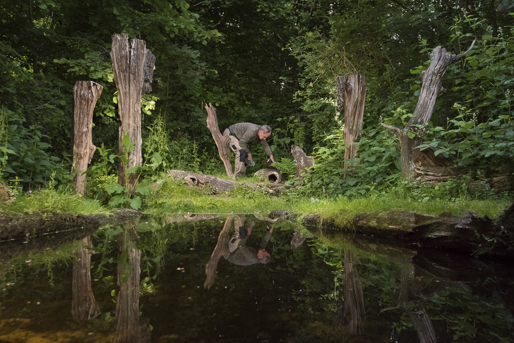 We hadden om half 8 in Zwolle afgesproken, zodat we rond negen uur ’s avonds in de hut konden zijn. Edo had verteld dat de bunzing al vaak vroeg op de avond komt. En dat klonk ons natuurlijk als muziek in de oren. Via een uitgebreide routeomschrijving wandelden we het laatste stukje naar de hut via een fietspad. Daar stond een sleutelkastje en met de ontvangen code konden we door een hek om bij de hut te komen. De hut zelf is vergeleken bij mijn eigen boshut heel luxe. Er is plek voor 4 personen naast elkaar met uitzicht op een vijver (die aansluit op de hut op ooghoogte), met daarachter wat stronken op een kleine open plek in een verder vrij donker bosje. Gelukkig is er een LED-lamp die automatisch aangaat in de schemering. Op deze manier kun je de hele nacht doorgaan met observeren en fotograferen. In de hut is verder een WC, stroom, water en een koelkastje. In de winter is er zelfs verwarming. Dus het romantische plaatje van natuurfotografen die heel wat ontberingen doorstaan voor een perfecte foto kan ook in de prullenbak in. Het is in elk geval heel wat minder primitief dan mijn eigen boshutje.