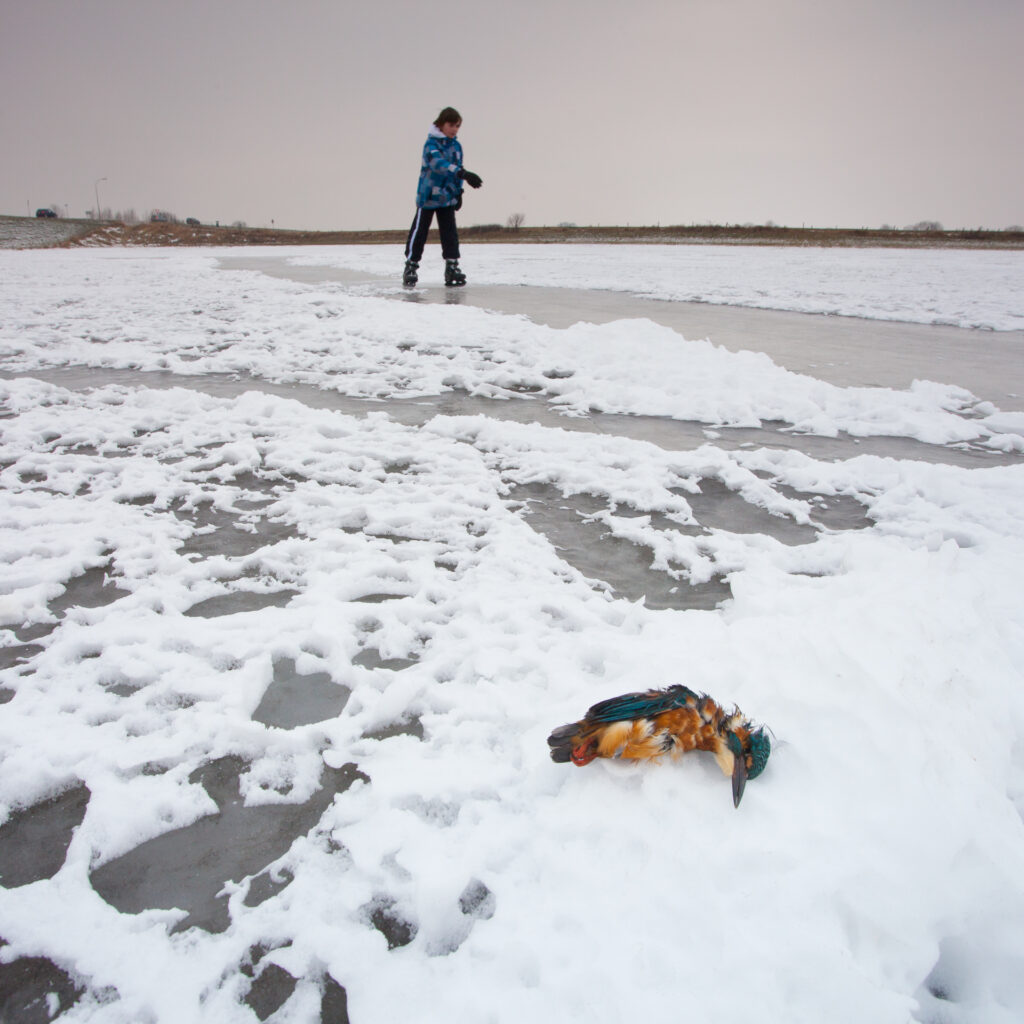 Op dit moment gaat het best goed met de ijsvogels. Er zijn nu naar schatting 1250 broedparen in Nederland. Maar door een strenge winter kunnen veel ijsvogels doodgaan en kan het soms jaren duren voordat de populatie weer op het oude niveau is. Deze ijsvogel overleefde de strenge winter van een paar jaar geleden niet en vond ik dood op het ijs.